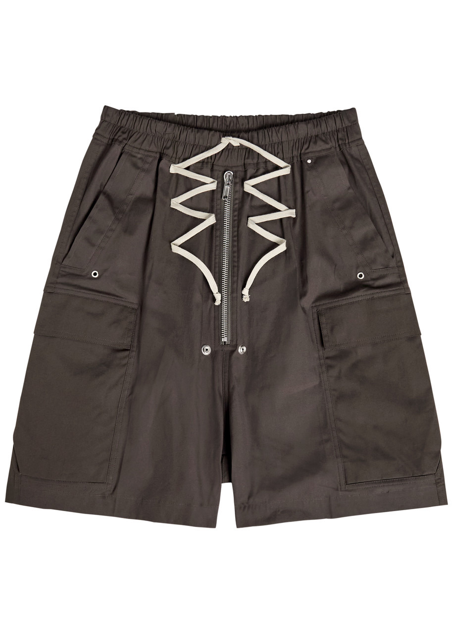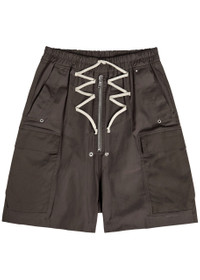 Info & Care Rick Owens stretch-cotton shorts Elasticated drawstring waistband, zip-fastening fly, pressed crease through front, side slip pockets, press-stud fastening;front flap pockets, stud and eyelet embellishments, two press-stud fastening back slit pockets Pull on 97% cotton, 3% elastane Hand wash Size & Fit Length waist to hem:;22 inches/ 56cm Midweight Relaxed fit Model is 6'1"/ 186cm;and wears a size IT48