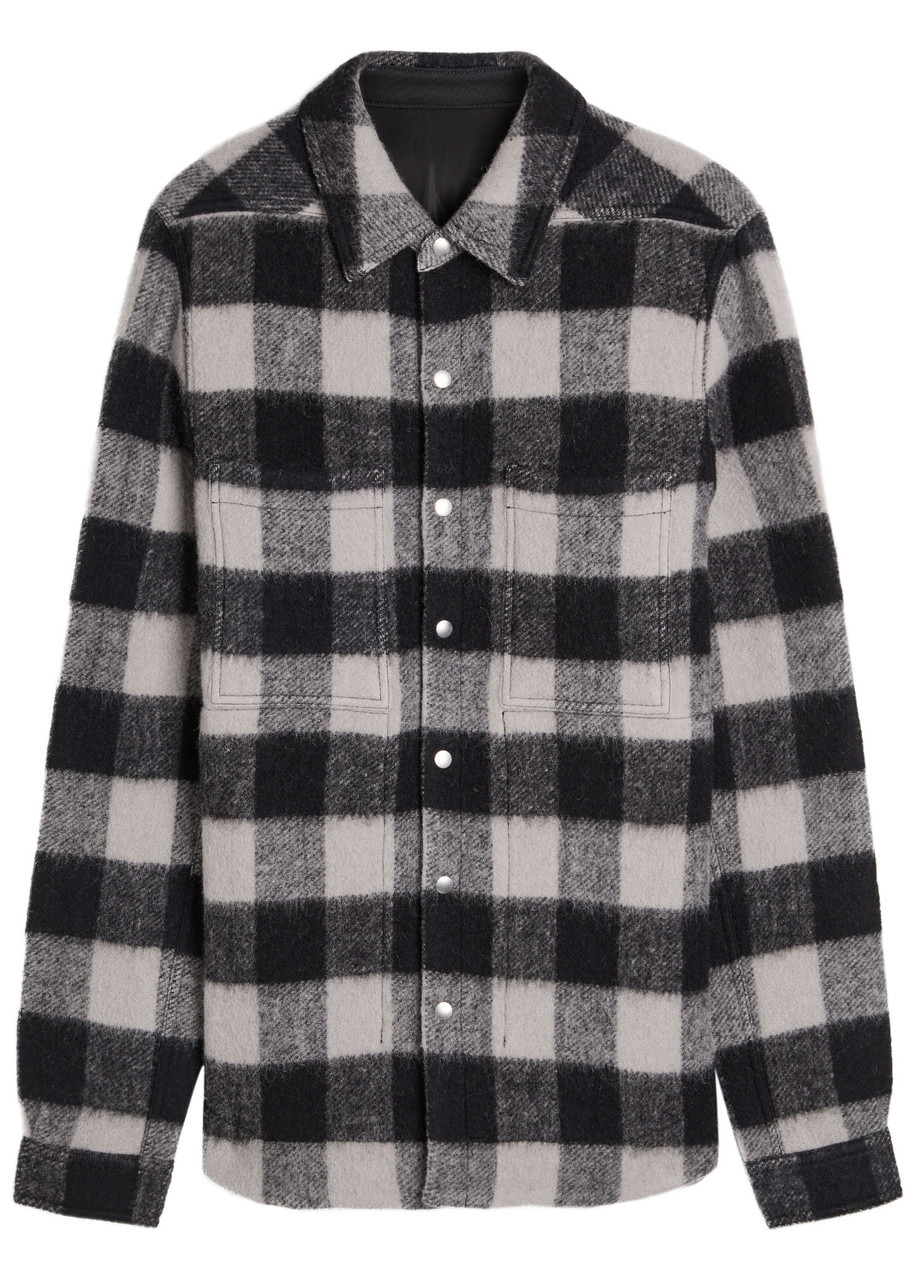 Info & Care Rick Owens;wool;overshirt Checked, push-stud fastening cuffs, two chest patch pockets, canvas tab across back neck, curved hem, two internal zip-fastening pockets, Push-stud fastenings through front 100%;wool Dry clean Size & Fit Length shoulder to hem: 31 inches/ 78.5cm Midweight Relaxed fit Model is 6'1"/ 185cm, chest size 38.5 inches and wears a size;IT48
