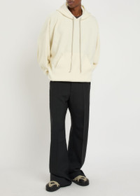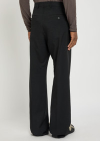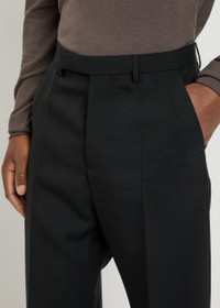 Info & Care Rick Owens wool trousers Belt loops, side slip pockets, pressed crease through legs, button-fastening back pockets Concealed hook and button fastenings at front 100% wool Dry clean Size & Fit Inside leg length: 34 inches/ 86cm Midweight Mid-rise fit, wide-leg cut Model is 6'1"/ 185cm and wears a size;IT48
