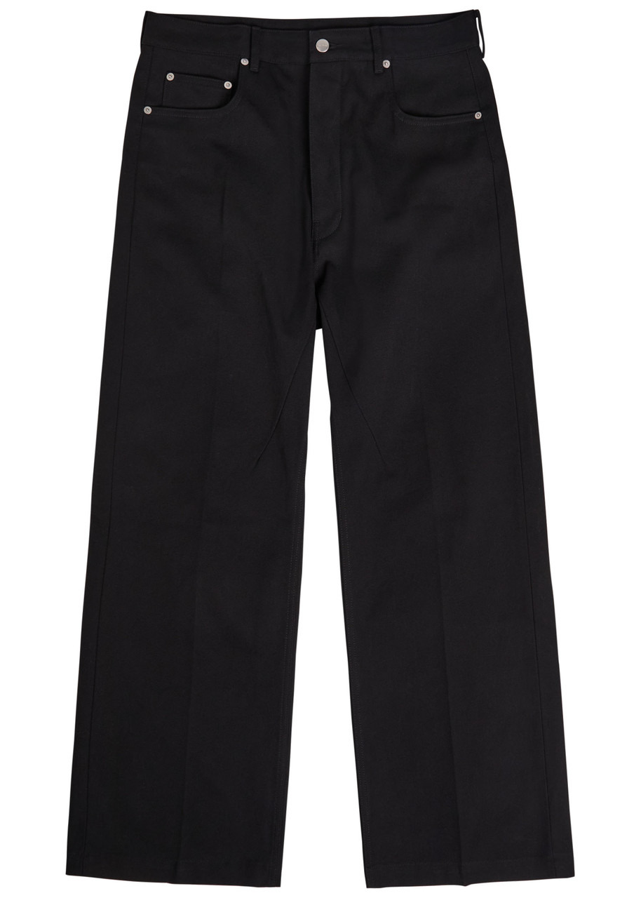 Info & Care Rick Owens twill jeans High-rise fit, wide-leg cut, belt loops, five pockets, pressed crease through legs Partially concealed button fastenings through front 100% cotton Dry clean Size & Fit Front rise: 14 inches/ 35.5cm Inside leg length: 30.5 inches/ 77.5cm Midweight Model is 6'1"/ 185cm, chest size 38.5 inches and wears a size;W32