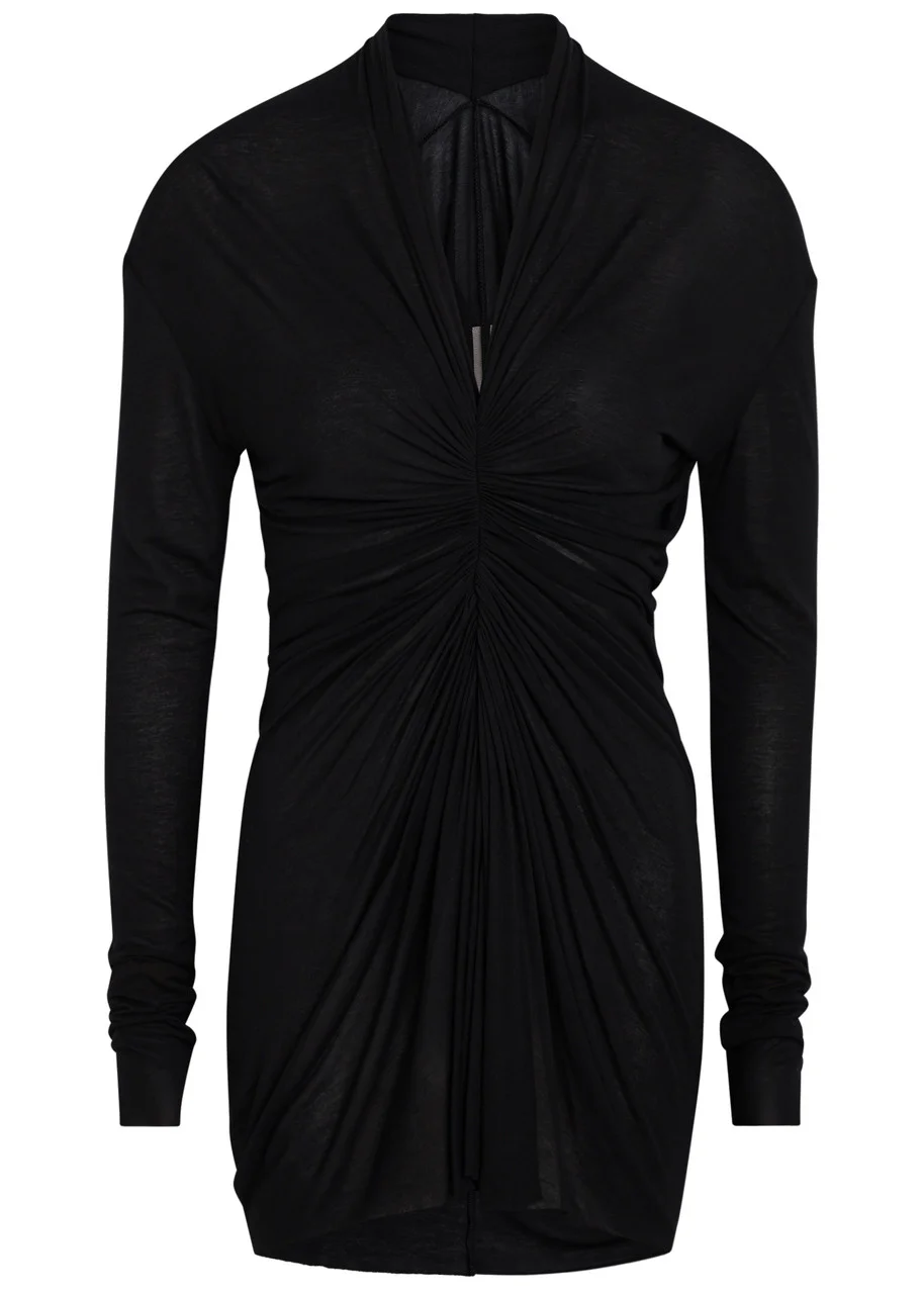Info & Care Rick Owens jersey top Ruched, V-neck Slips on 88% viscose, 12% silk Hand wash Size & Fit Length shoulder to hem: 29 inches/ 73.5cm Lightweight Slim fit Model is 5'10"/ 178cm and wears a size;IT40