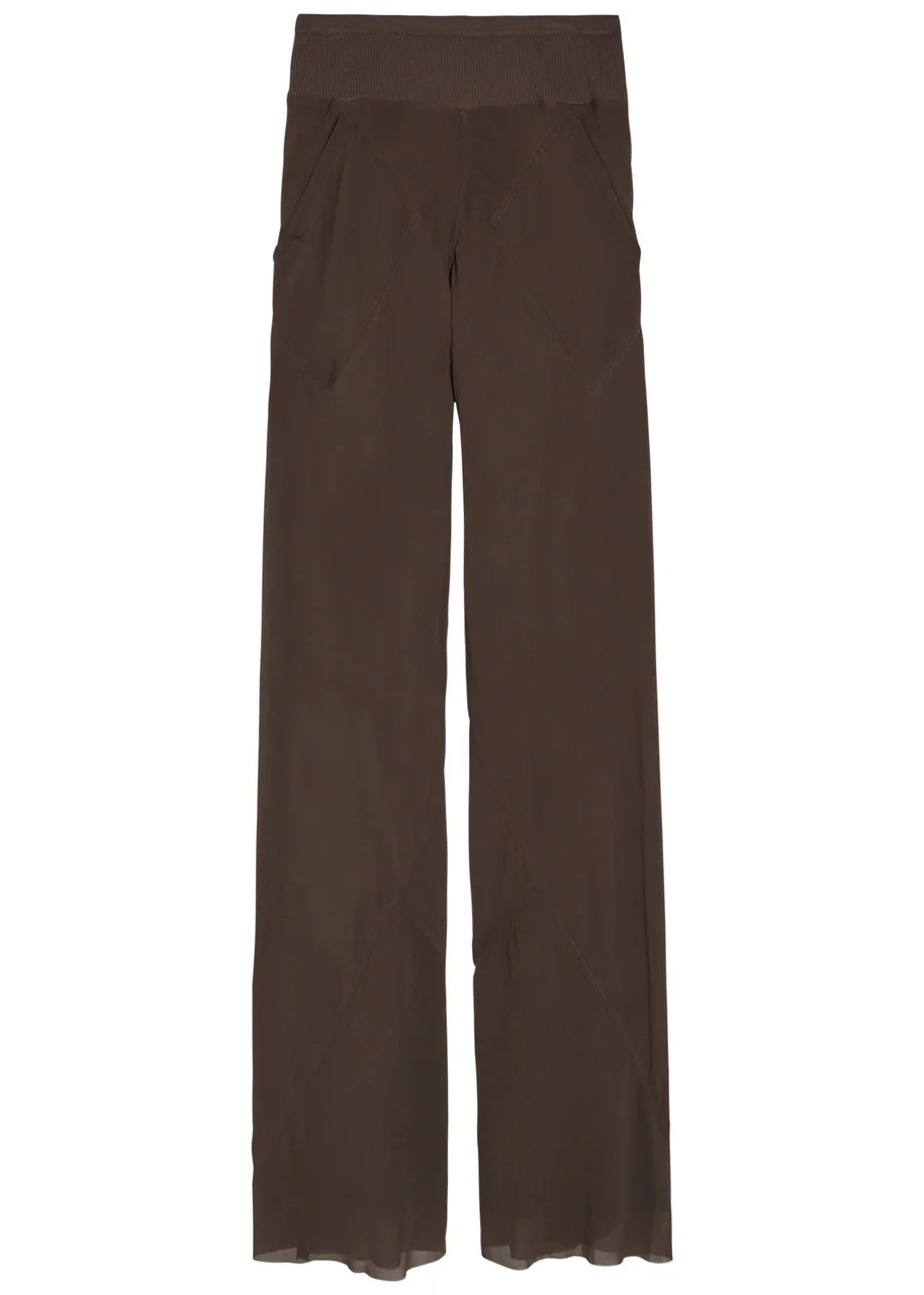 Info & Care Rick Owens silk-georgette trousers Ribbed waistband, side slip pockets, panelled, raw-edged cuffs, fully lined; Pull on 100% silk; lining: 100%;cupro Hand wash Size & Fit Inside leg length: 41 inches/ 104cm Midweight Wide-leg cut, relaxed style Model is 5'10"/ 178cm and wears a size;IT40 Please note, this style is particularly long in length