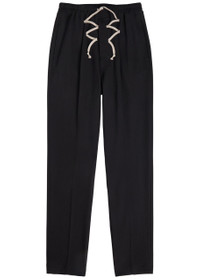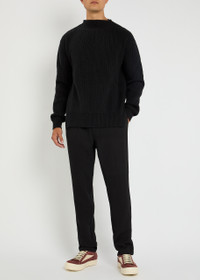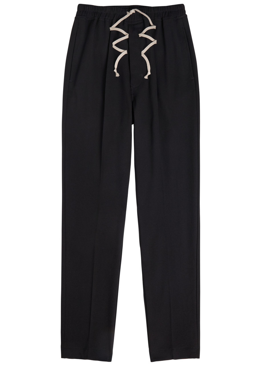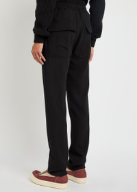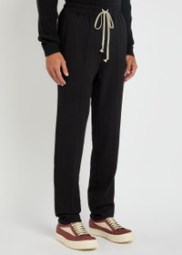 Info & Care Rick Owens wool trousers Elasticated drawstring waistband, button-fastening fly, side slip pockets, pressed crease through legs, two back flap pockets Pull on 100% wool Dry clean Size & Fit Inside leg length: 31 inches/ 78.5cm Midweight Tapered-leg cut Model is 6'1"/ 186cm and wears a size IT48