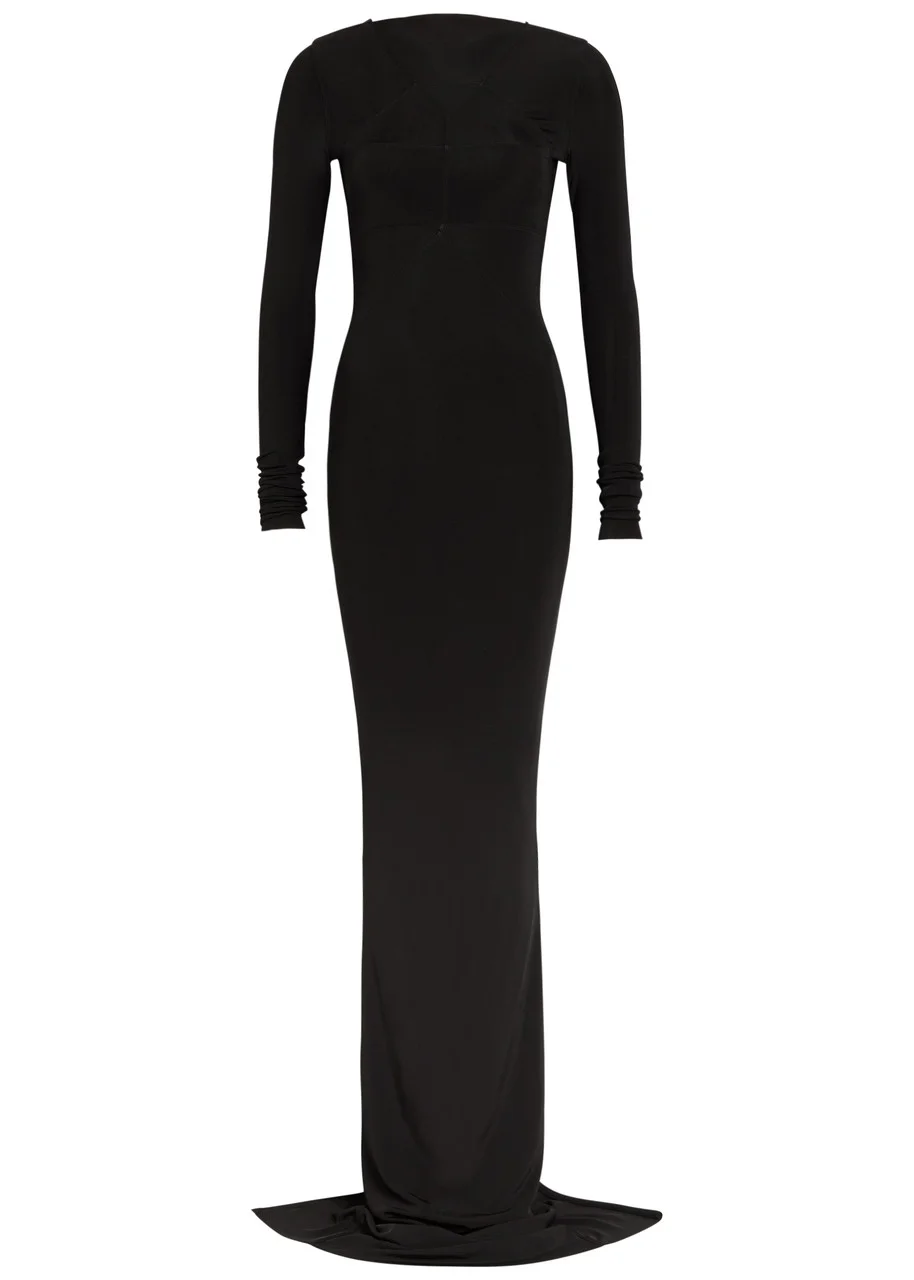 Info & Care Rick Owens semi-sheer stretch-tulle;gown Boat-neck, panelled, exposed seams Slips on; 93% viscose, 7% elastane Hand wash Size & Fit Length shoulder to hem: 64 inches/ 162.5cm Midweight Slim fit Model is 5'9"/ 175cm and wears a size;IT40