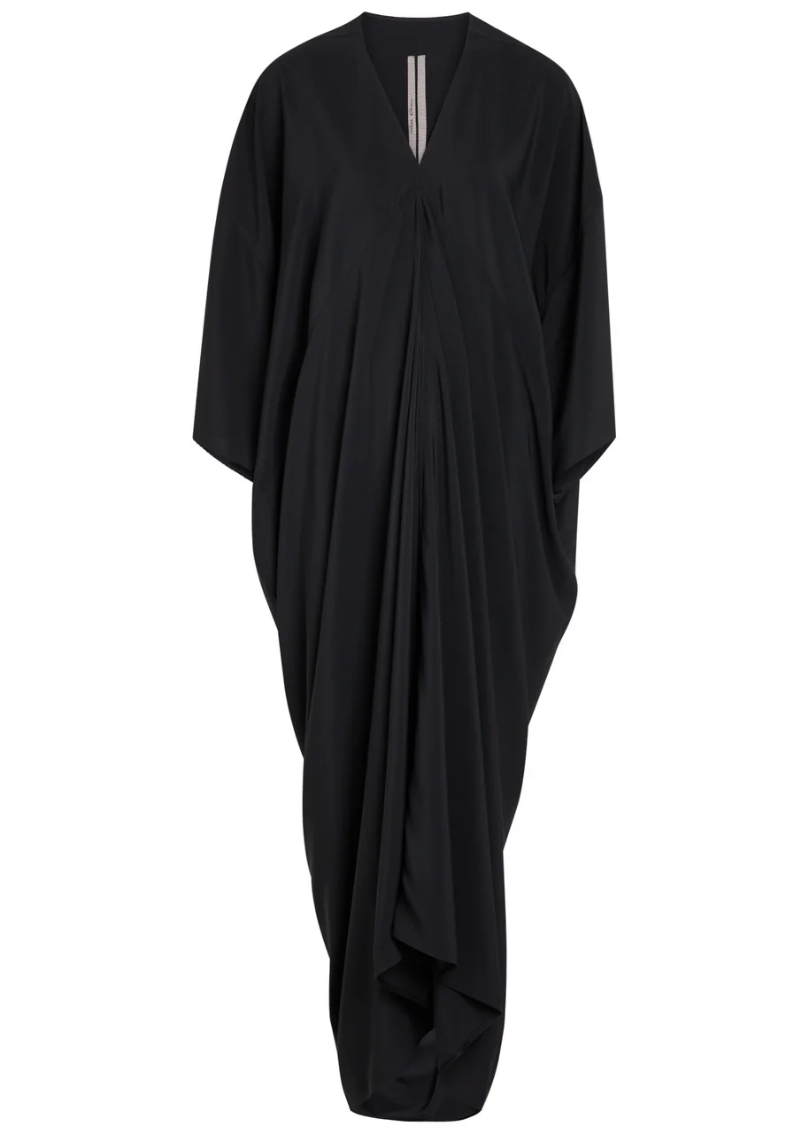 Info & Care Rick Owens crepe dress Draped, V-neck, batwing sleeves, longer back hem Slips on 64% acetate, 36% silk Dry clean Size & Fit Length shoulder to hem: 47 inches/ 119.5cm; back: 62 inches/ 157.5cm Midweight Relaxed fit Model is 5'10"/ 178cm and wears a size;IT40