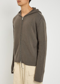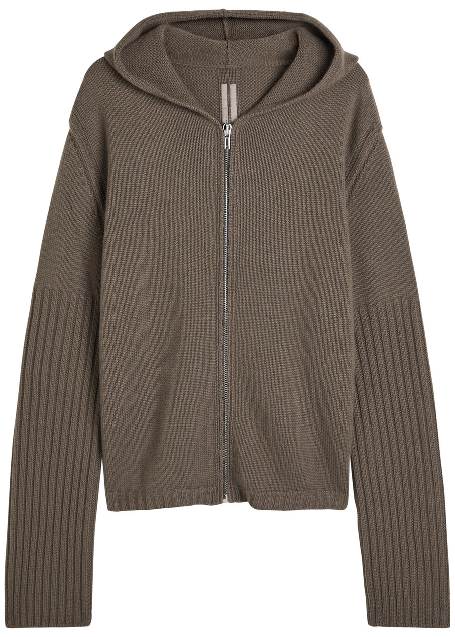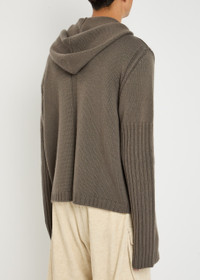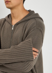 Info & Care Rick Owen cashmere jumper Hood, ribbed panel through sleeves, exposed seams, ribbed hem Zip-fastening through front 100% cashmere Hand wash Size & Fit Length shoulder to hem:;26 inches/ 66cm Midweight Relaxed fit Model is 6'1"/ 186cm, chest size 38 inches and wears a size medium;