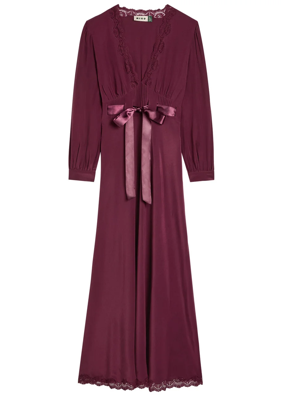 Info & Care Rixo silk dress V-neck, button-fastening cuffs, belt loops, ribbon belt, lace trims Concealed zip fastening at side 100% silk Dry clean Size & Fit Length shoulder to hem: 51 inches/ 129.5cm Midweight Slim across the bust and waist, loose through the skirt Model is 5'9"/ 175cm and wears a size;UK8