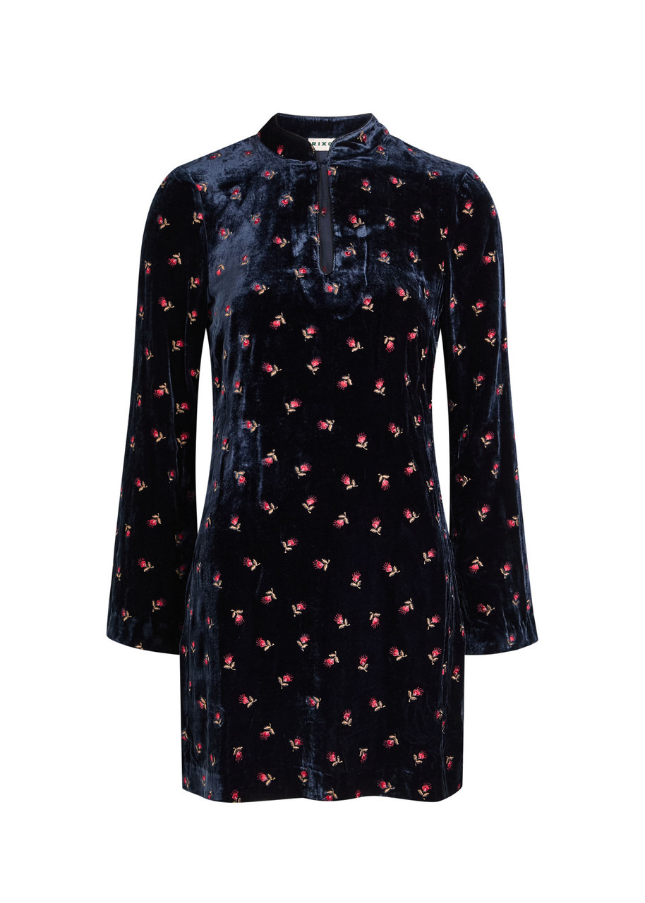 Info & Care Rixo velvet dress Floral embroidery, mandarin collar, button-fastening keyhole at bust, piped trims Slips on 81% viscose, 19% silk Dry clean Size & Fit Length shoulder to hem: 32 inches/ 81.5cm Midweight Regular fit Model is 5'10"/ 178cm and wears a size UK8