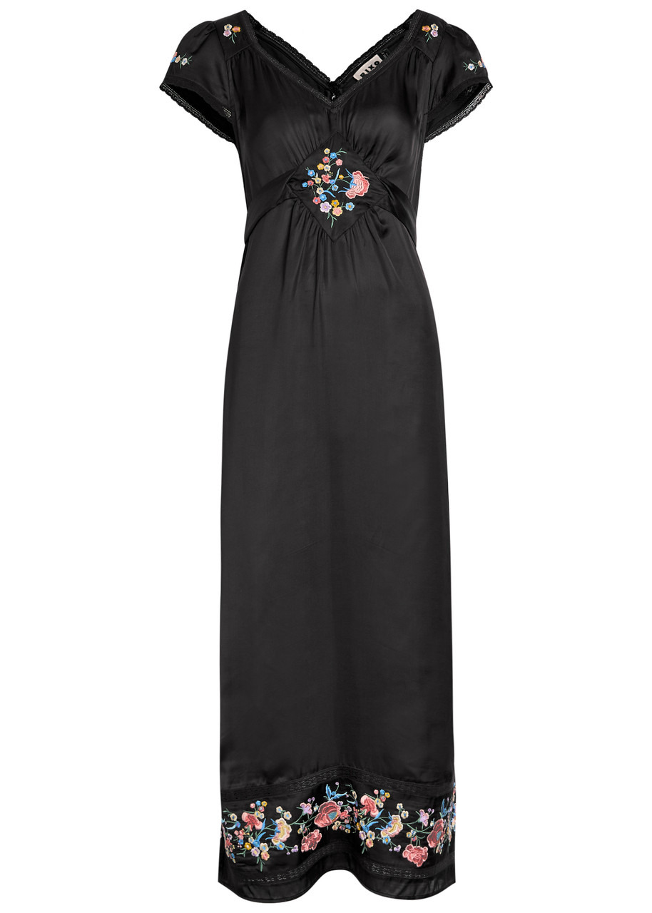 Info & Care Rixo satin dress V-neck, cap sleeves, floral embroidery, tie-fastening at bust, gathered details, back vent, scalloped lace trims Concealed zip fastening at back 61% viscose, 39% modal Machine wash Size & Fit Length shoulder to hem: 51 inches/ 129.5cm Midweight Slightly relaxed fit Model is 5'10"/ 178cm and wears a size UK8