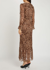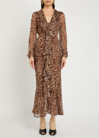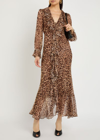 Info & Care Rixo chiffon dress Leopard print, V-neck, button-fastening cuffs, ruffled trims, pleated details Concealed zip fastening at side and button fastenings through front 100% viscose Dry clean Size & Fit Length shoulder to hem: 55 inches/ 140cm Midweight Slim fit,;loose hem Model is 5'10"/ 178cm and wears a size;UK8