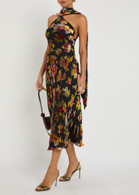Info & Care Rixo chiffon dress; Velvet floral devore,;detachable neck scarf, halterneck, adjustable cross-over straps at open back Slips on Concealed zip fastening at;side 72% viscose, 28% silk; lining:;100% viscose Dry clean; Size & Fit Length shoulder to hem: 56 inches/ 142cm Midweight Slim fit, loose from the hips Model is 5'10"/ 178cm and wears a size;UK8