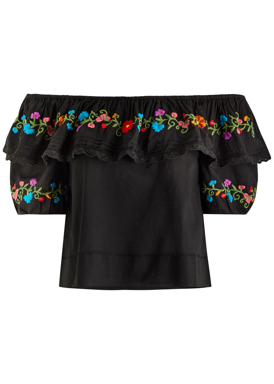 Info & Care Rixo cotton top Floral embroidery, scalloped trims at off-the-shoulder neckline, partially lined Slips on 100% cotton Hand wash Size & Fit Length shoulder to hem: 18 inches/ 45.5cm Midweight Regular fit Model is 5'10"/ 178cm and wears a size;UK8