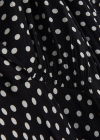 Info & Care Rixo woven dress Polka dot print, V-neck, smocked detail at bust, tie-fastening back waist, gathered details Concealed zip fastening at side 100% viscose Dry clean Size & Fit Length shoulder to hem: 54 inches/ 137cm Midweight Relaxed fit, use tie to cinch the waist Model is 5'9"/ 175cm and wears a size;small