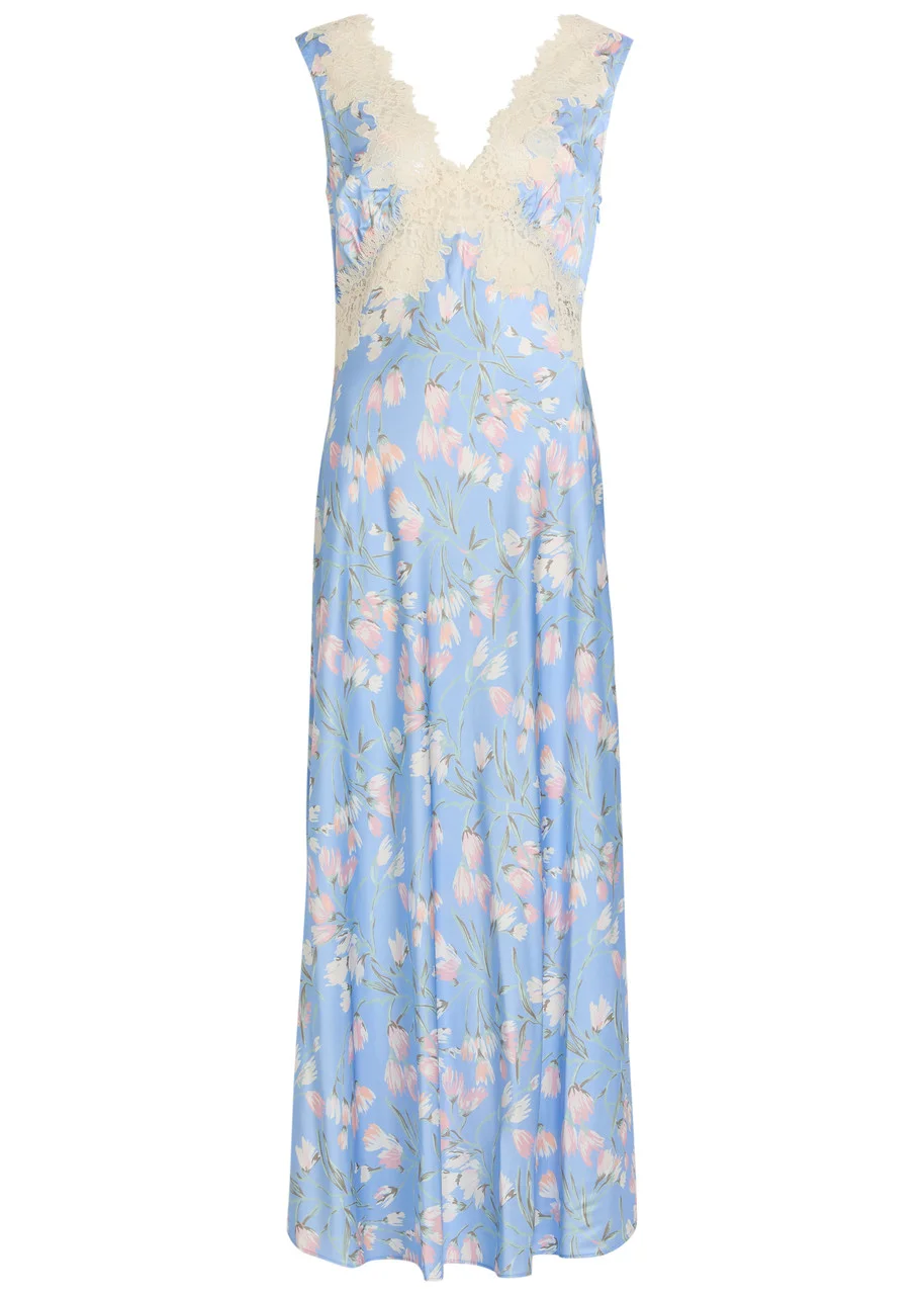 Info & Care Rixo satin dress Floral print, V-neck, signature underbust seam, floral eyelash lace trims; Concealed zip fastening at side 100% viscose Dry clean Size & Fit Length shoulder to hem: 54 inches/ 137cm Midweight Slim bodice, relaxed through skirt; Model is 5'10"/ 178cm and wears a size UK8