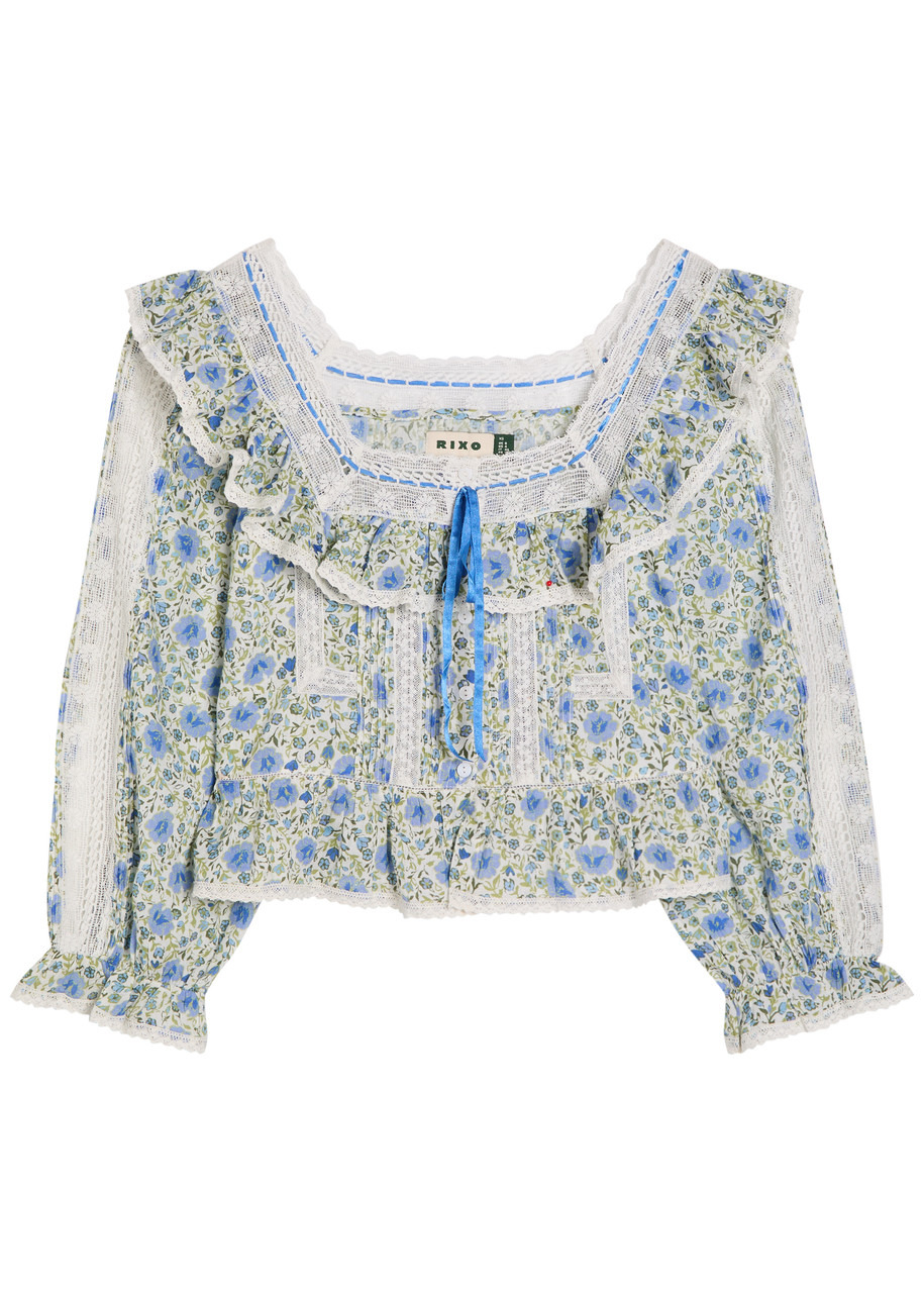 Info & Care Rixo cotton blouse Floral print, square-neck with bow embellishment, elasticated cuffs, pintuck panel at front and back, lace inserts, gathered details, ruffled trims Button-fastenings through front 100% cotton Hand wash Size & Fit Length shoulder to hem: 19 inches/ 48cm Midweight Slightly relaxed fit Model is 5'10"/ 178cm and wears a size UK8