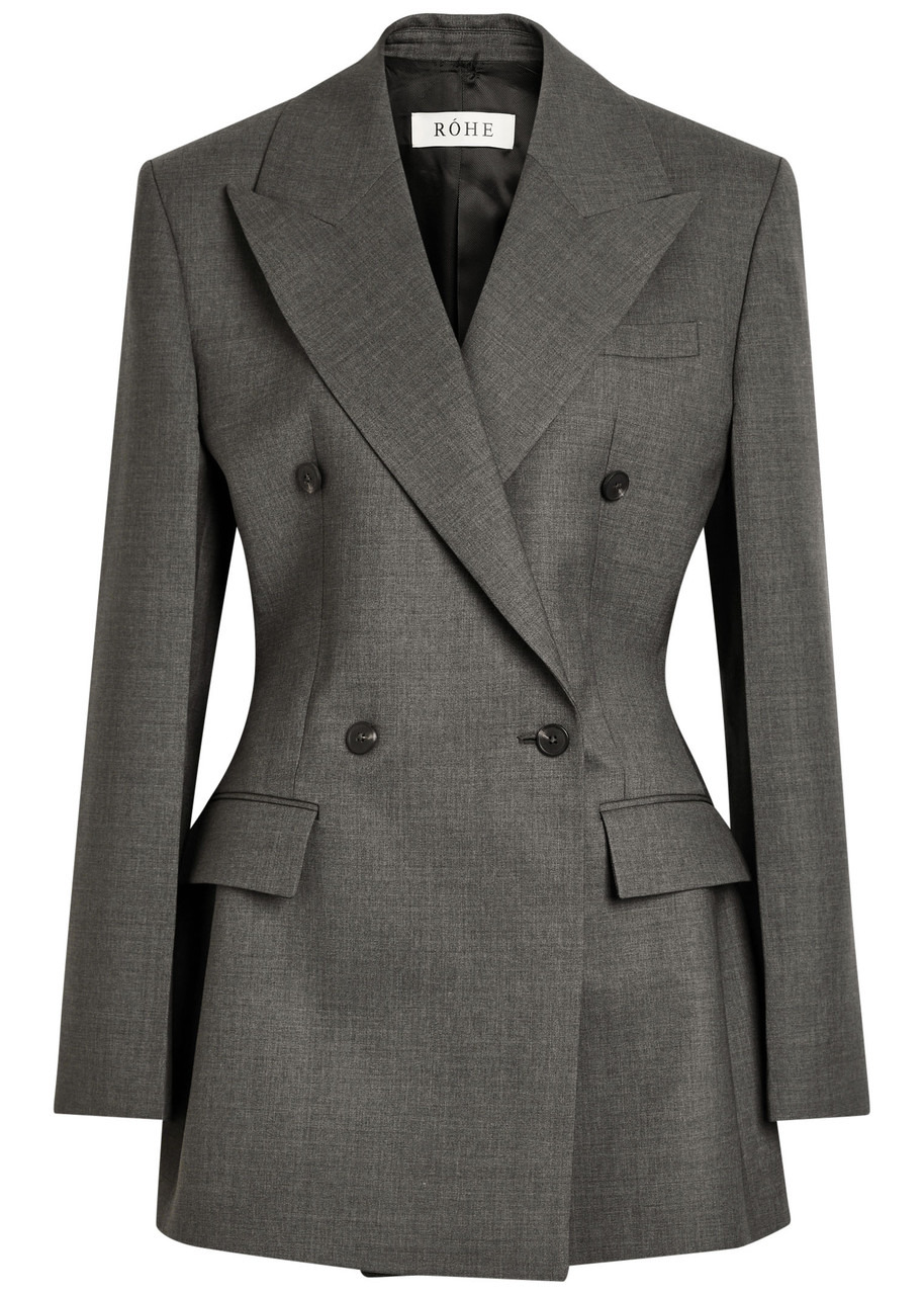 Info & Care Rohe stretch-wool blazer Peaked lapels, padded shoulders, button-fastening cuffs, faux chest slit pocket, two front flap pockets, back vent, fully lined Double-breasted button fastenings through front; 98% virgin wool, 2% elastane; lining: 100% viscose Dry clean Size & Fit Length shoulder to hem: 32 inches/ 81cm Midweight Oversized fit Tailored style Model is 5'9"/ 175cm and wears a size;FR36