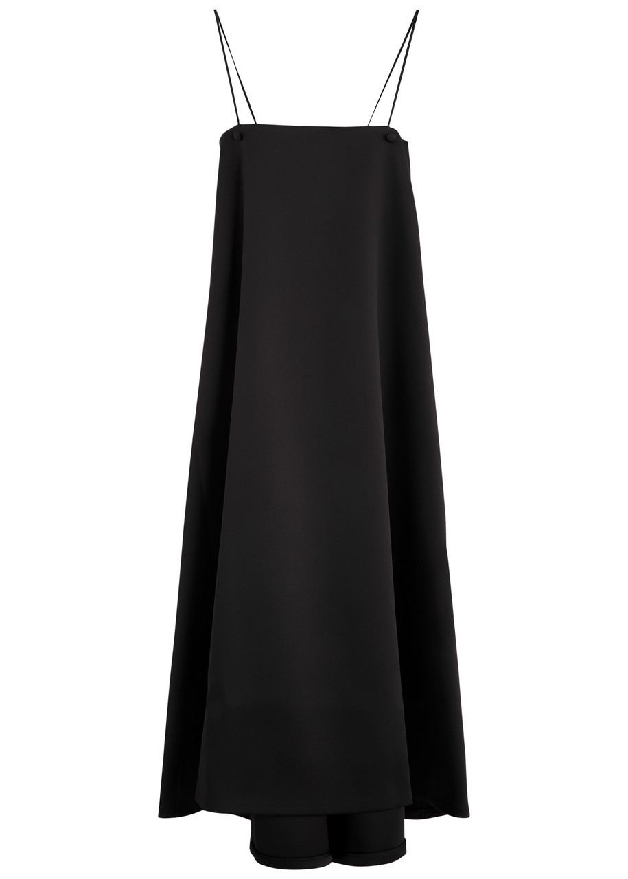 Info & Care Rohe satin dress Square neck, button embellishments, two slip pockets, longer back hem Concealed zip fastening at back; 95% recycled polyester, 5% elastane; Dry clean; Size & Fit Length shoulder to hem: 52 inches/ 132cm; back: 56.5 inches/ 143.5cm Midweight; Loose flared fit,;slim across the bust; Model is 5'9"/ 175cm and wears a size;FR36