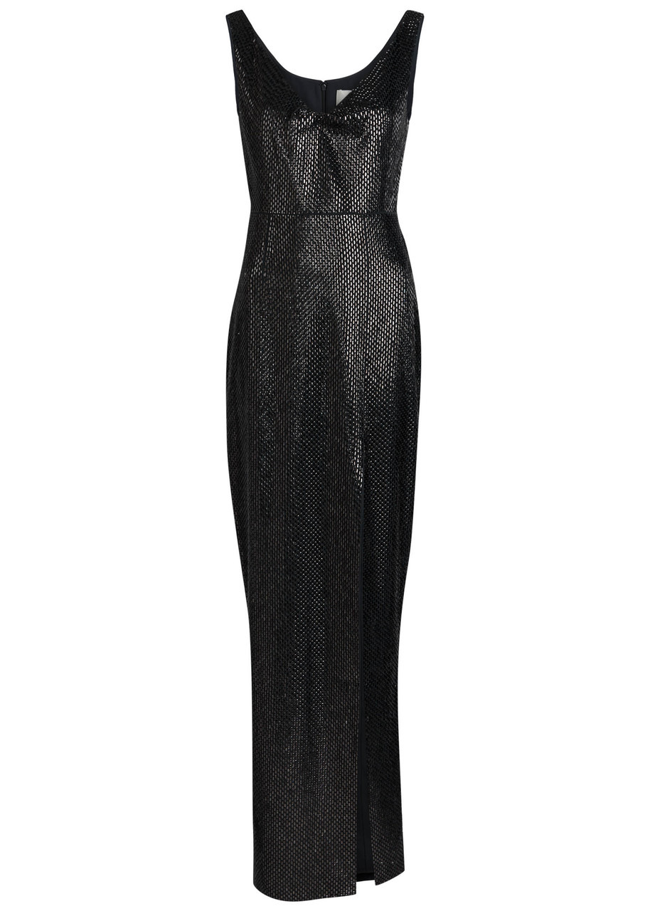 Info & Care Roland Mouret crepe;gown Crystal embellishments, V-neck, darts through waist, side split, fully lined Concealed zip fastening at back Fabric 1: 95% polyamide, 5% elastane; fabric 2: 84% polyester, 11% viscose, 5% elastane; lining: 100% polyester; Dry clean; Coordinating items available Size & Fit Length shoulder to hem: 61 inches/ 155cm Heavyweight Fitted style, straight cut Model is 5'9"/ 175cm and wears a size;US4