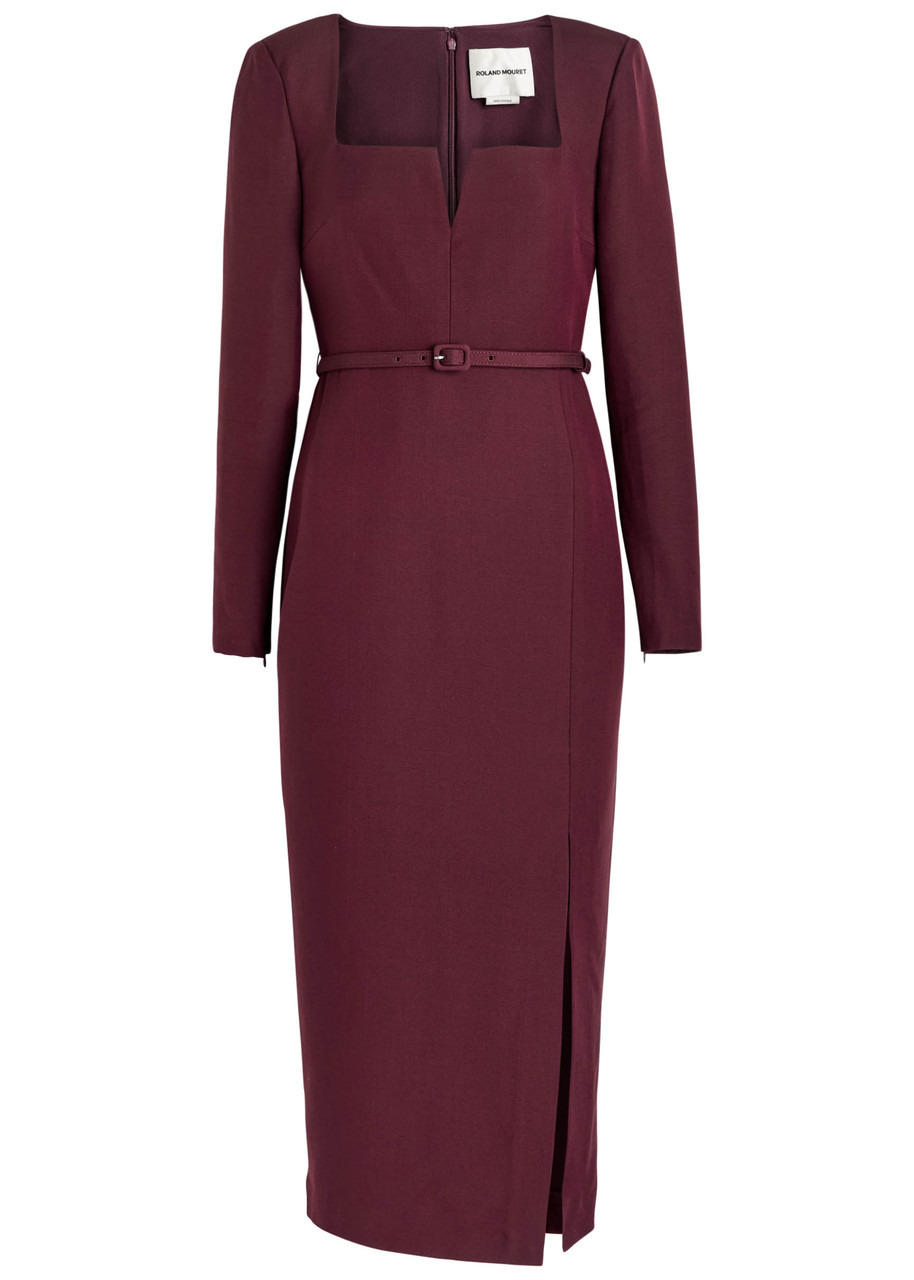 Info & Care Roland Mouret wool and silk-blend dress Square neck, padded shoulders, zip-fastening cuffs, boned cut-out at bust, belt loops, buckle-fastening belt, thigh split, partially lined Concealed hook and zip fastening at back 68% wool, 32% silk; lining: 100% polyester Dry clean Size & Fit Length shoulder to hem: 27 inches/ 68.5cm Midweight Slim fit Model is 5'10"/ 178cm and wears a size;US4