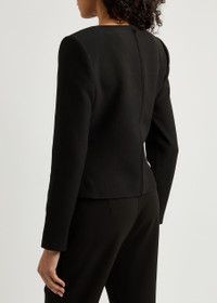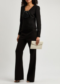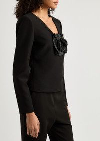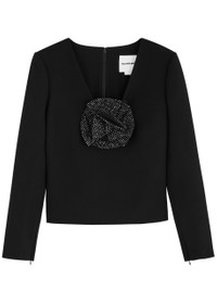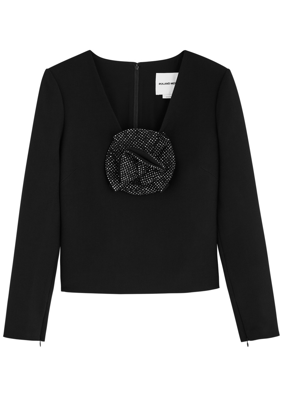 Info & Care Roland Mouret crepe top V-neck, padded shoulders, zip-fastening cuffs, crystal-embellished floral applique at front, fully lined Zip-fastening through back 84% polyester, 10% viscose, 6% elastane; lining: 100% polyester Dry clean Size & Fit Length shoulder to hem: 21 inches/ 53cm Midweight Regular fit Model is 5'9"/ 175cm and wears a size UK8