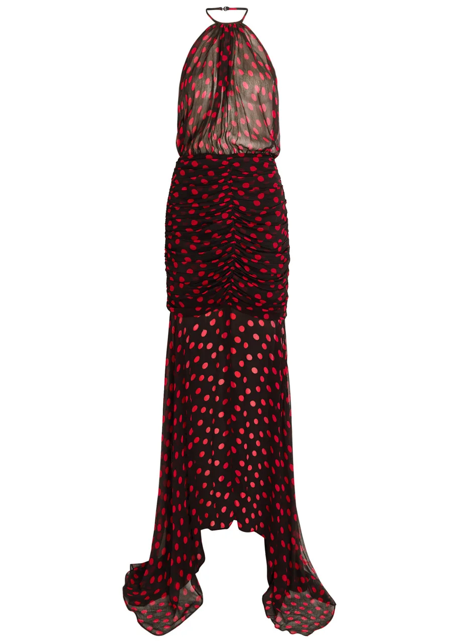 Info & Care Ronny Kobo chiffon dress Polka-dot, button-fastening halterneck, ruching across waist and hips, asymmetric hem, partially lined Concealed hook and zip fastening at back 100% viscose; lining: 100% polyester Dry clean Size & Fit Length shoulder to hem: 1: 55 inches/ 139.5cm; 2: 65 inches/ 165cm Midweight Loose bodice and skirt, slim at waist Model is 5'10"/ 178cm and wears a size small
