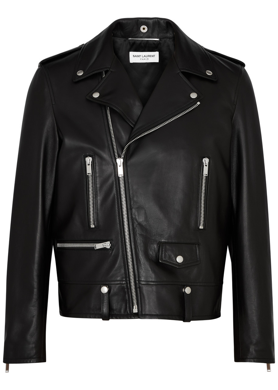 STYLE NOTES Anthony Vaccarello takes classic bike codes in Saint Laurent’s precise and polished direction for this jacket. Expertly cut from smooth leather, this slim style is designed with notched lapels and is accented with chunky zipped hardware through the front and cuffs. INFO & CARE - Saint Laurent leather jacket - Notched lapels, press-stud fastening epaulettes, zip-fastening cuffs, three zip-fastening front pockets, press-stud fastening flap pocket, belt loops at hem, fully lined - Asymmetric zip fastening through front - 100% lamb leather; lining: 60% cupro, 40% cotton; padding: 100% polyester - Specialist clean SIZE & FIT - Length shoulder to hem: 25 inches/ 63.5cm - Midweight - Slim fit - Model is 6'1"/ 185cm, chest size 38 inches and wears a size IT50