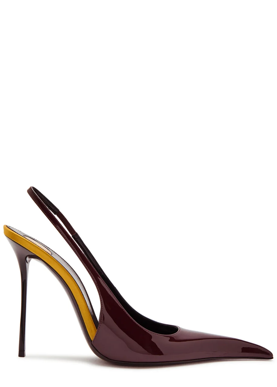 Info & Care Saint Laurent patent leather pumps Heel measures approximately 4.5 inches/ 110mm Partially elasticated slingback strap, satin trim, pointed toe Slip-on Size & Fit Only available in full sizes, go up to the nearest whole size if you take a half size