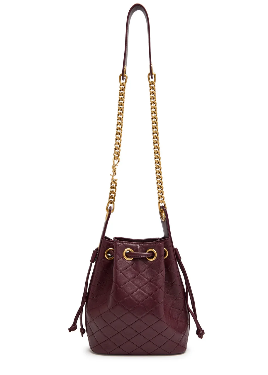 Info & Care Saint Laurent leather bucket bag Chain and leather shoulder strap,;quilted stitching, fully lined Drawstring top Size & Fit Width: 6 inches/ 15cm Height: 7 inches/ 17.5cm Depth: 4.5 inches/ 11.5cm Shoulder strap drop: 14.5 inches/ 37cm