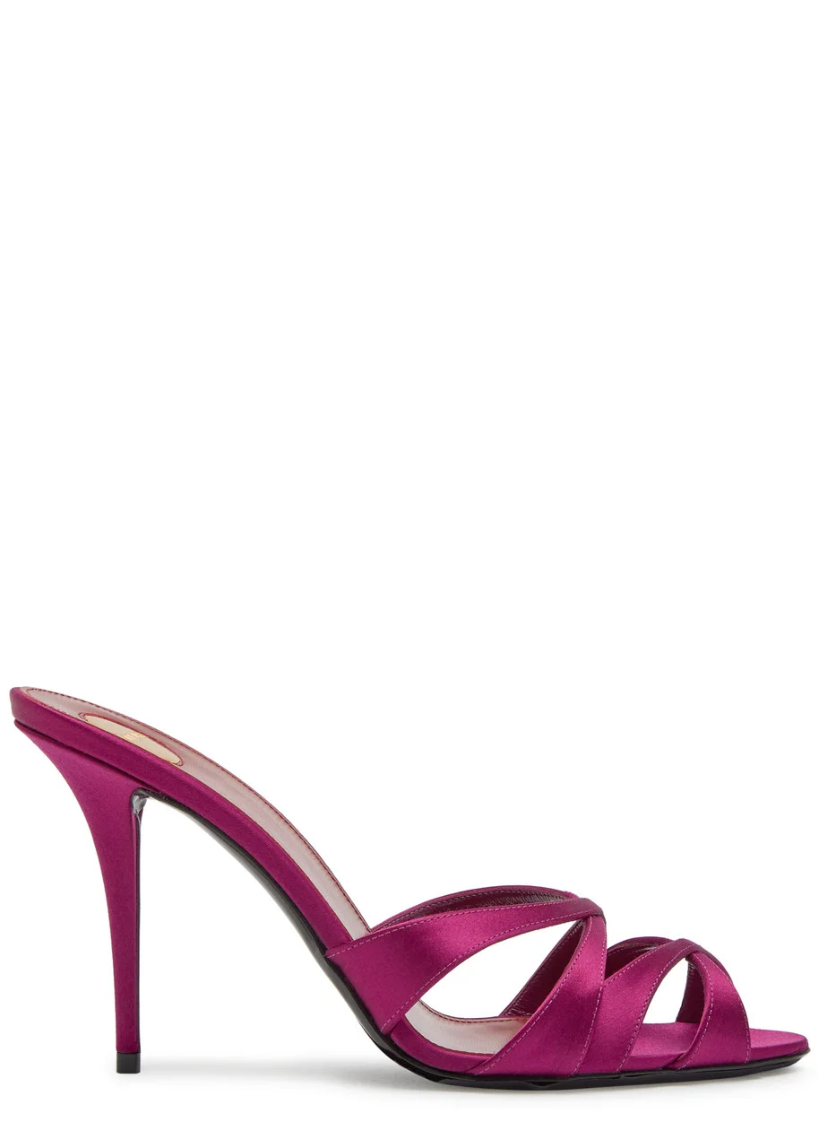 Info & Care Saint Laurent satin mules Heel measures approximately 3.75 inches/ 95mm Cross-over straps, almond toe Slip-on Size & Fit Only available in full sizes, go up to the nearest whole size if you take a half size