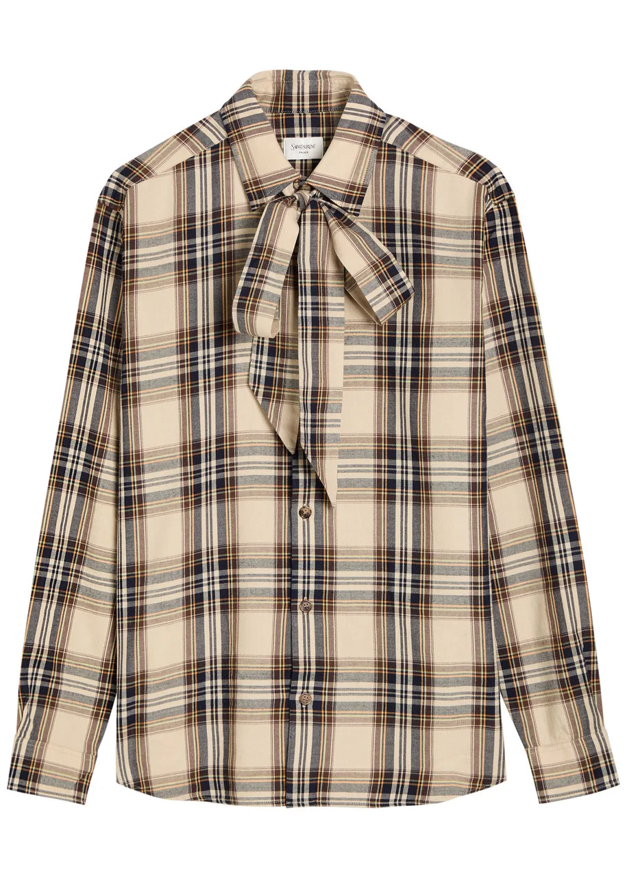 Info & Care Saint Laurent cotton-blend shirt Checked, tie fastening at neck, button-fastening cuffs, curved hem Button fastenings through front 51% cotton, 49% cupro Dry clean Size & Fit Length shoulder to hem: 27 inches/ 68.5cm Midweight Relaxed fit Model is 5'9"/ 175cm and wears a size;small