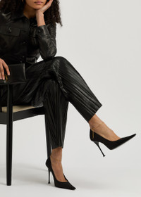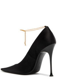 Info & Care Saint Laurent satin pumps Heel measures approximately 4.5 inches/ 100mm Detachable adjustable anklet embellishment with logo plaque, pointed toe Slip-on Size & Fit Only available in full sizes, go up to the nearest whole size if you take a half size