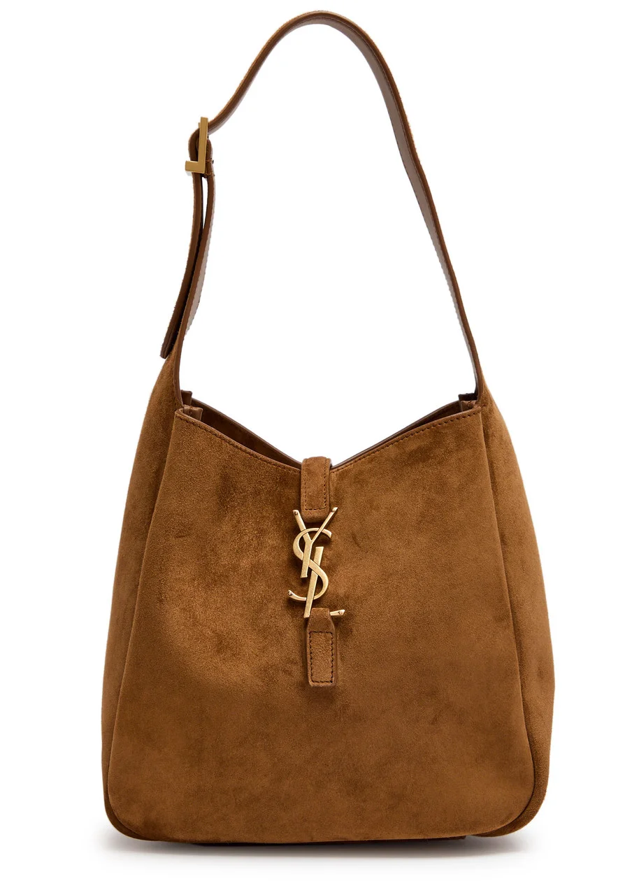 Info & Care Saint Laurent;suede hobo bag; Adjustable shoulder strap, designer plaque, internal zip-fastening pouch, partially lined; Logo hook fastening at open top Size & Fit Width: 8.5 inches/ 21.5cm; Height: 8 inches/ 20.5cm; Depth: 3.5 inches/ 9cm; Min. shoulder strap drop: 8 inches/ 20.5cm Max. shoulder strap drop: 9 inches/ 23cm;