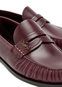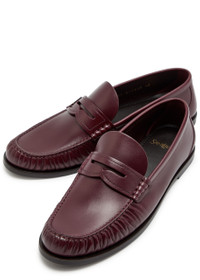 Info & Care Saint Laurent leather loafers Stacked wooden heel measures approximately 0.5 inch/ 10mm Logo plaque at penny strap, pleated details, almond toe Slip-on Size & Fit Only available in full sizes, go up to the nearest whole size if you take a half size