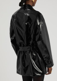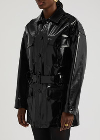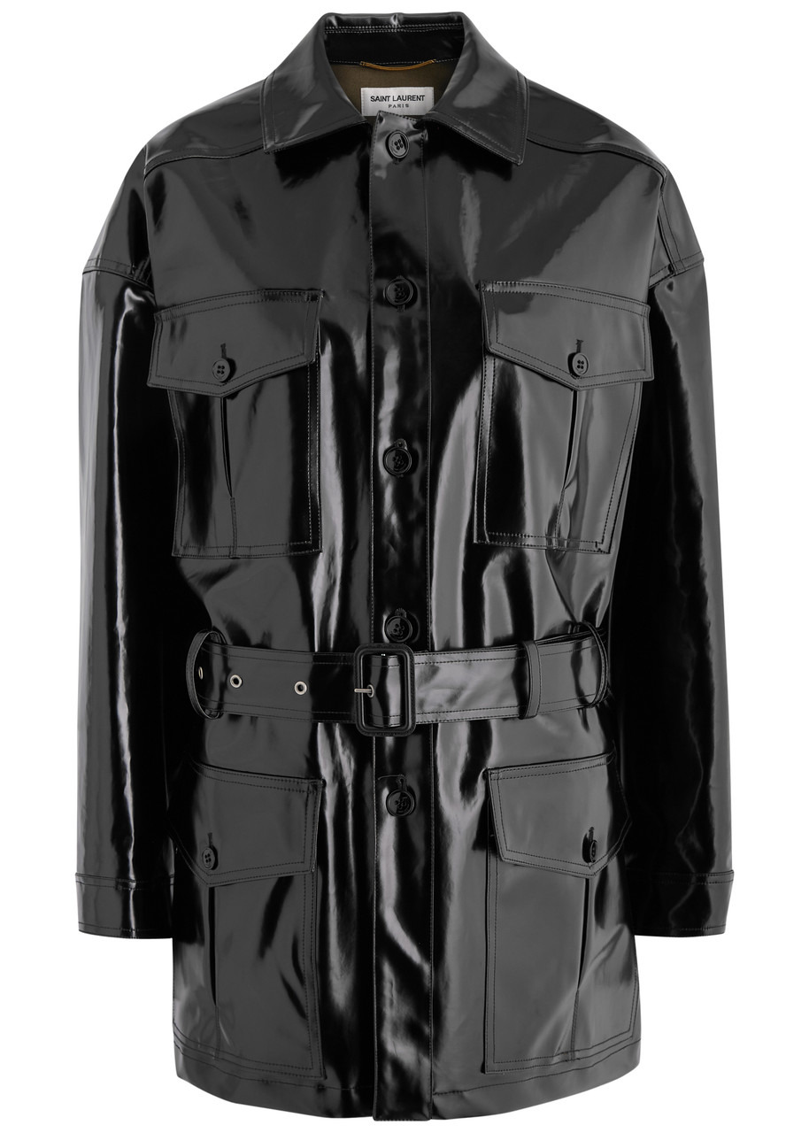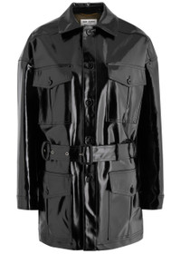 Style Notes The Saharienne jacket is a signature design of Saint Laurent and has been recreated in glossy vinyl for a modern edge this season. This high-shine style is panelled with utilitarian pockets and features a buckle-fastening belt to cinch the waist. Info & Care Saint Laurent vinyl jacket Dropped shoulders, button-fastening cuffs, four button-fastening flap pockets, belt loops, detachable adjustable buckle-fastening belt, elasticated back waist, fully lined Button fastenings through front 100% cotton; coating: 100% polyurethane; lining: 100% cotton Specialist clean Size & Fit Length shoulder to hem: 32 inches/ 81cm Midweight Slightly relaxed fit, use belt to cinch waist Model is 5'10"/ 178cm and wears a size FR36