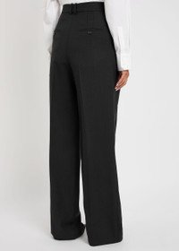 Info & Care Saint Laurent wool trousers Belt loops, pleats at waist, side slip pockets, pressed crease through legs, two button-fastening back slit pockets, unfinished cuffs to allow for leg alterations Concealed zip, hook and button fastenings at front 100% wool Dry clean Size & Fit Inside leg length: 37 inches/ 94cm Midweight Wide-leg cut Model is 5'8"/ 173cm and wears a size FR36