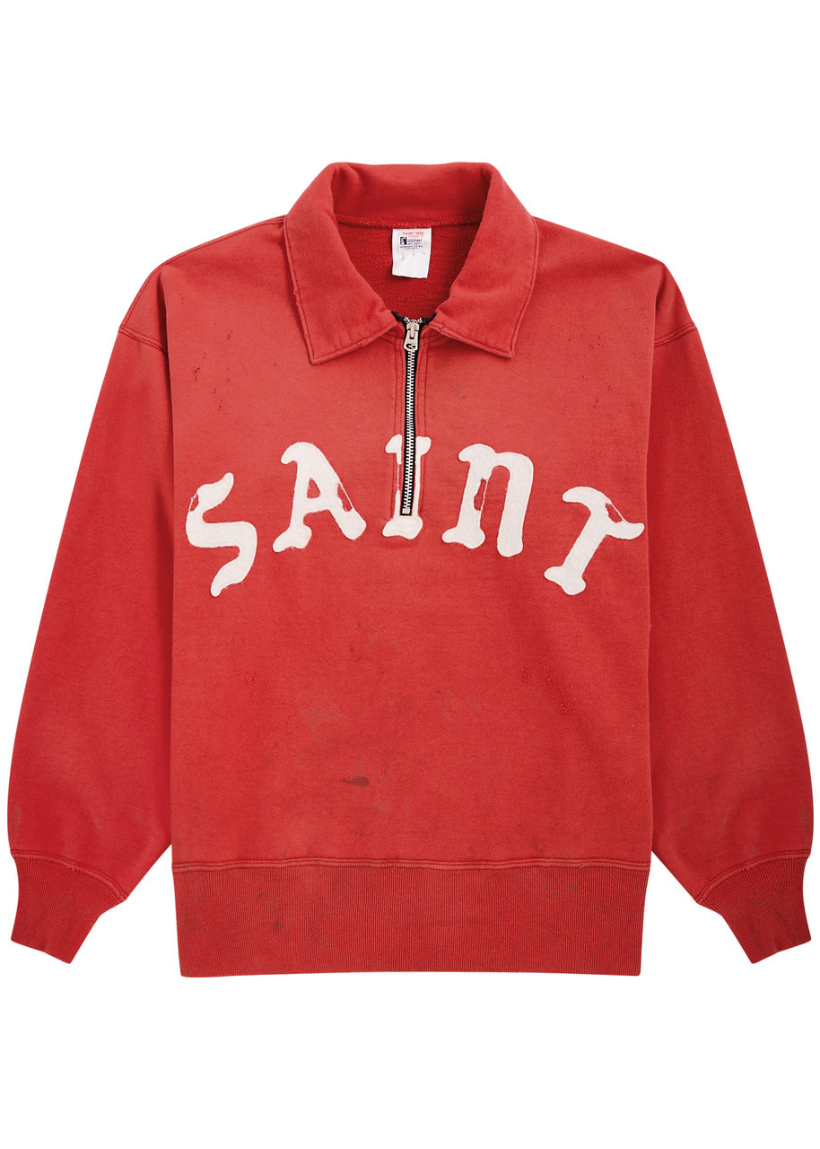 INFO & CARE - Saint MXXXXXX half-zip cotton sweatshirt - Zip-fastening neck, dropped shoulders, logo appliqué at front, ribbed trims, distressed details - Slips on - 100% cotton - Hand wash SIZE & FIT - Length shoulder to hem: 25 inches/ 63.5cm - Midweight - Relaxed fit - Model is 6'1"/ 185cm, chest size 38 inches and wears a size medium