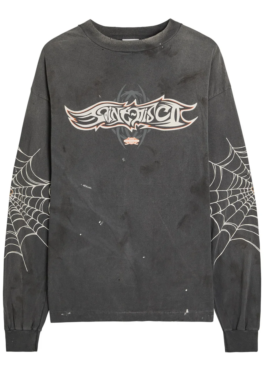 Info & Care Saint MXXXXXX cotton;top Printed chest and back, crew-neck, dropped shoulders, spiderweb print through sleeves, paint splatter-effect details, distressed and faded finish Slips on; 100% cotton Hand wash Size & Fit Length shoulder to hem: 27 inches/ 68.5cm Midweight Relaxed fit Model is 6'2"/ 188cm, chest size 38 inches and wears a size medium