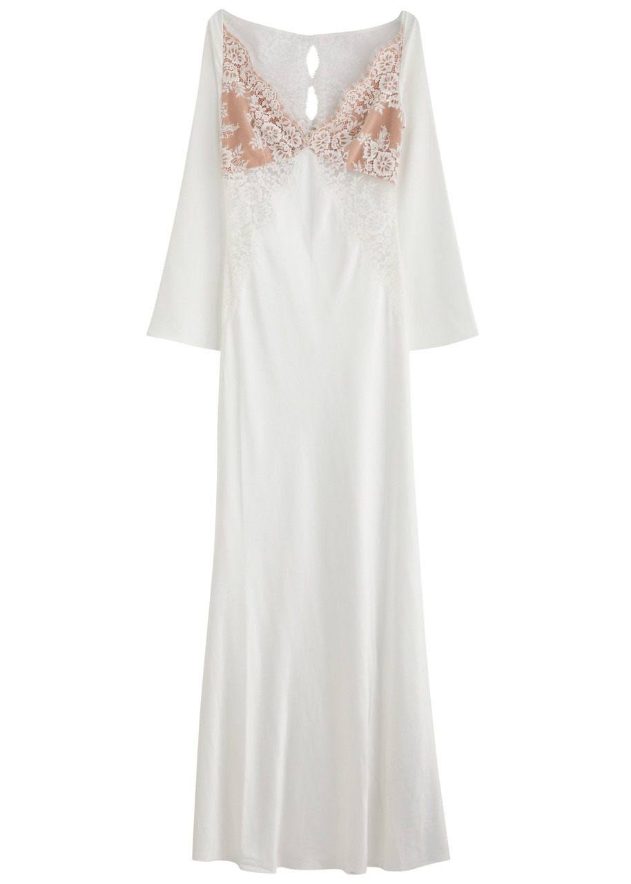 Info & Care Self-Portrait satin dress Plunge v-neck, lace panels with scalloped eyelash trims, flared sleeves, puddle train, partially lined Button fastening keyhole and concealed zip fastenings at back; 100% polyester; lace: 52% polyamide, 48% cotton; lining: 87% polyester, 13% elastane Dry clean; Size & Fit Length shoulder to hem: 61.5 inches/ 156cm Midweight; Slim fit bodice, relaxed through hips; Model is 5'10"/ 178cm and wears a size;UK8