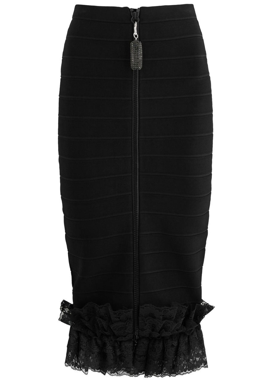 Style Notes Self-Portrait's stretch-knit skirt was designed by Christopher Kane for the label's first Residency collection. Sculpted to a slim fit, this ribbed midi style is spliced with a zip through the front that's decorated with a crystal-embellished pull and is finished with ruffled lace encircling the hem. Info & Care Self-Portrait;X Christopher Kane stretch-knit;skirt Ribbed,;elasticated waistband, ruffled lace hem Two-way zip fastening through;back 71% viscose, 27% polyamide, 2% elastane Dry clean Size & Fit Length;waist to hem: 29 inches/ 73.5cm Midweight Slim fit Model is 5'10"/ 178cm and wears a size UK8
