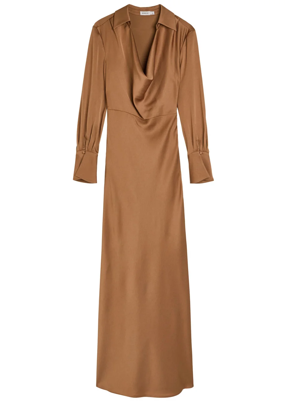 Info & Care Simkhai satin shirt dress Cowl-neck, collar, button-fastening cuffs Concealed zip fastening at side 84% acetate, 16% polyester Dry clean Size & Fit Length shoulder to hem: 62 inches/ 157.5cm Midweight Loose fit,;;slim across the waist Model is 5'9"/ 175cm and wears a size;US4