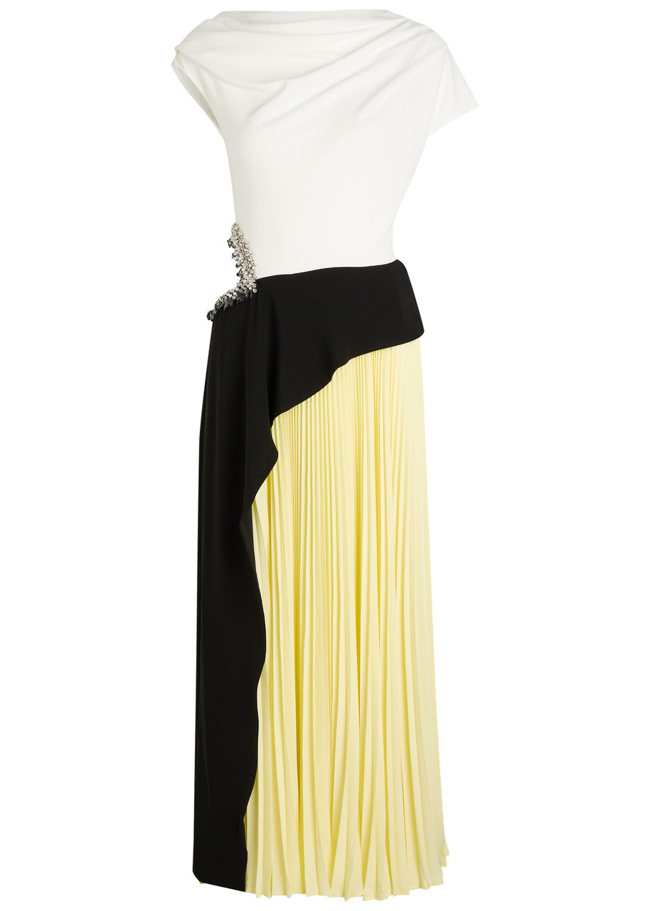 Info & Care Joanthan Simkhai crepe dress Colour blocked, crystal and bead-embellished cut-out at side, draped panel through waist and side, plisse skirt, fully lined Concealed zip fastening at side Fabric 1: 71% acetate, 29% polyester; fabric 2: 100% polyester; lining: 100% polyester Dry clean Size & Fit Length shoulder to hem:;58 inches/ 147cm Midweight Regular;fit,;loose from waist Model is 5'8"/ 173cm and wears a size;US4