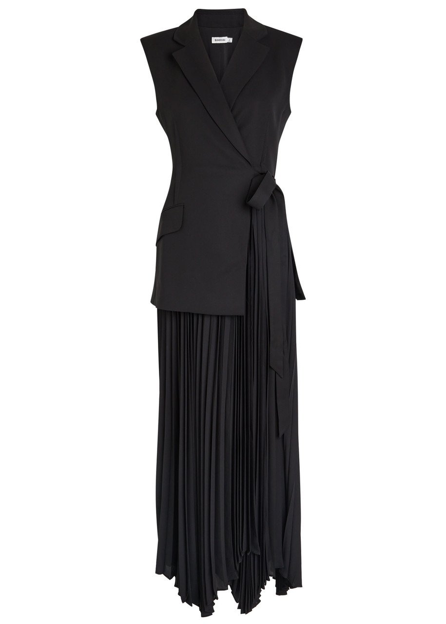 Info & Care Simkhai crepe and chiffon wrap dress Layered design, notched lapels, shoulder pads, faux flap pocket, pressed creases through skirt, partially lined Partially concealed button and tie fastening at wrap front 71% acetate, 29% polyester; fabric 2: 100% polyester; lining: 96% polyester, 4% spandex Dry clean Size & Fit Length shoulder to hem: 56.5 inches/ 143.5cm Midweight Fitted bodice, loose skirt Model is 5'9"/ 175cm and wears a size;US4