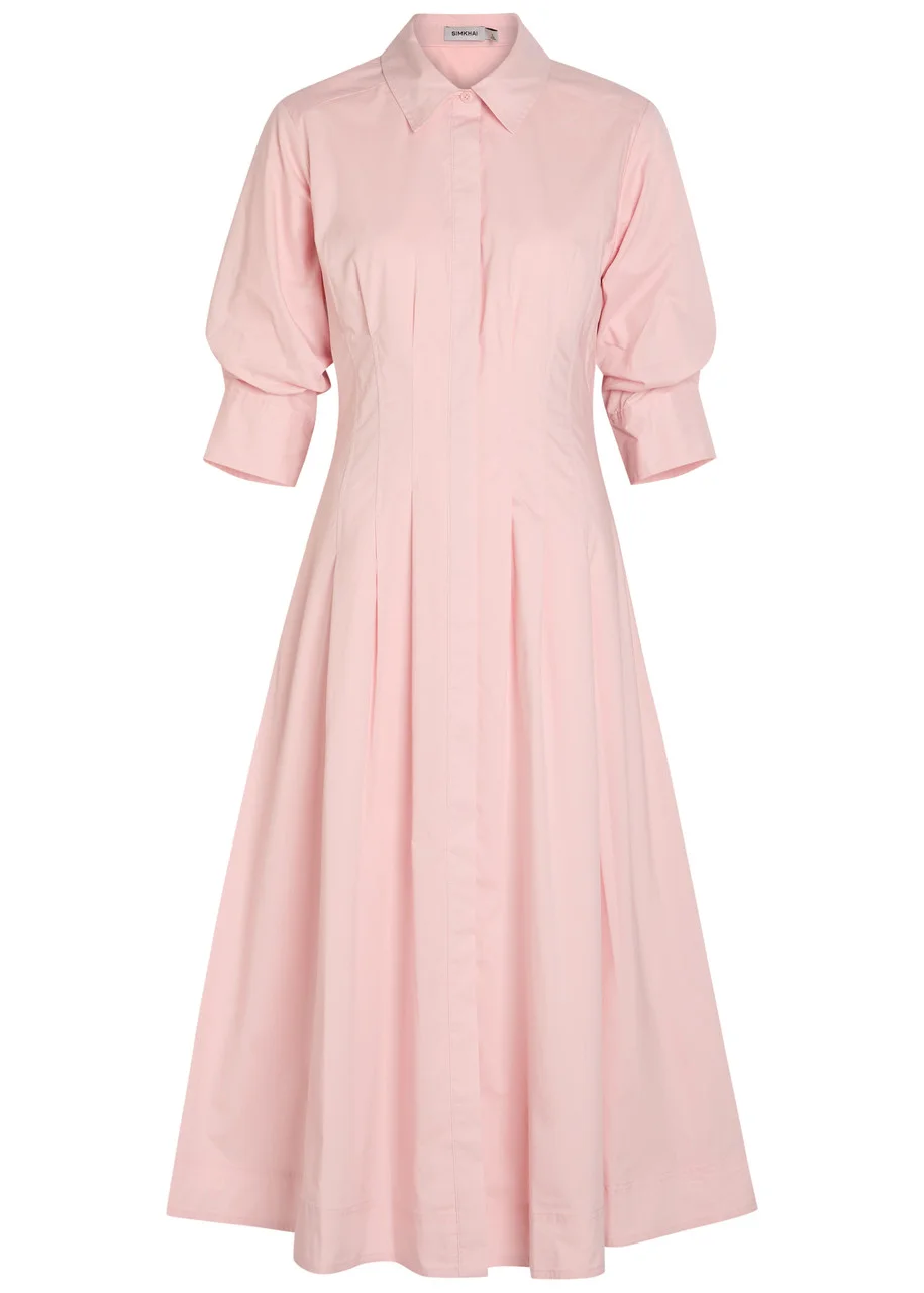Info & Care Simkhai cotton-blend poplin shirt dress; Pintucks through waist, gathered sleeves, button-fastening cuffs, pleated details, side slip pockets, fully lined; Concealed button fastenings through front; 63% cotton, 37% polyester; lining: 100% cotton Machine wash Size & Fit Length shoulder to hem: 49 inches/ 125cm Midweight Fitted at the waist, flared from the hips Model is 5'9"/ 175cm and wears a size small