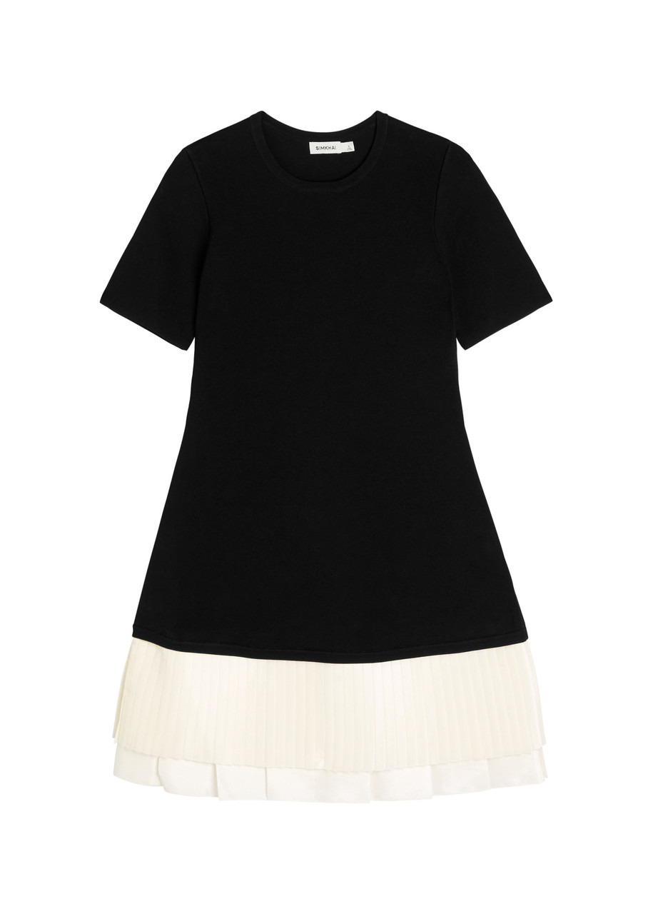 Info & Care Jonathan Simkhai knit dress Colour-block, crew-neck, pleated contrasting hem; Slips on 83% viscose, 17% elastane; fabric 2: 60% polyester, 40% nylon Hand wash Size & Fit Length shoulder to hem: 33 inches/ 84cm Midweight Slim fit, flared skirt Model is 5'9"/ 175cm and wears a size small