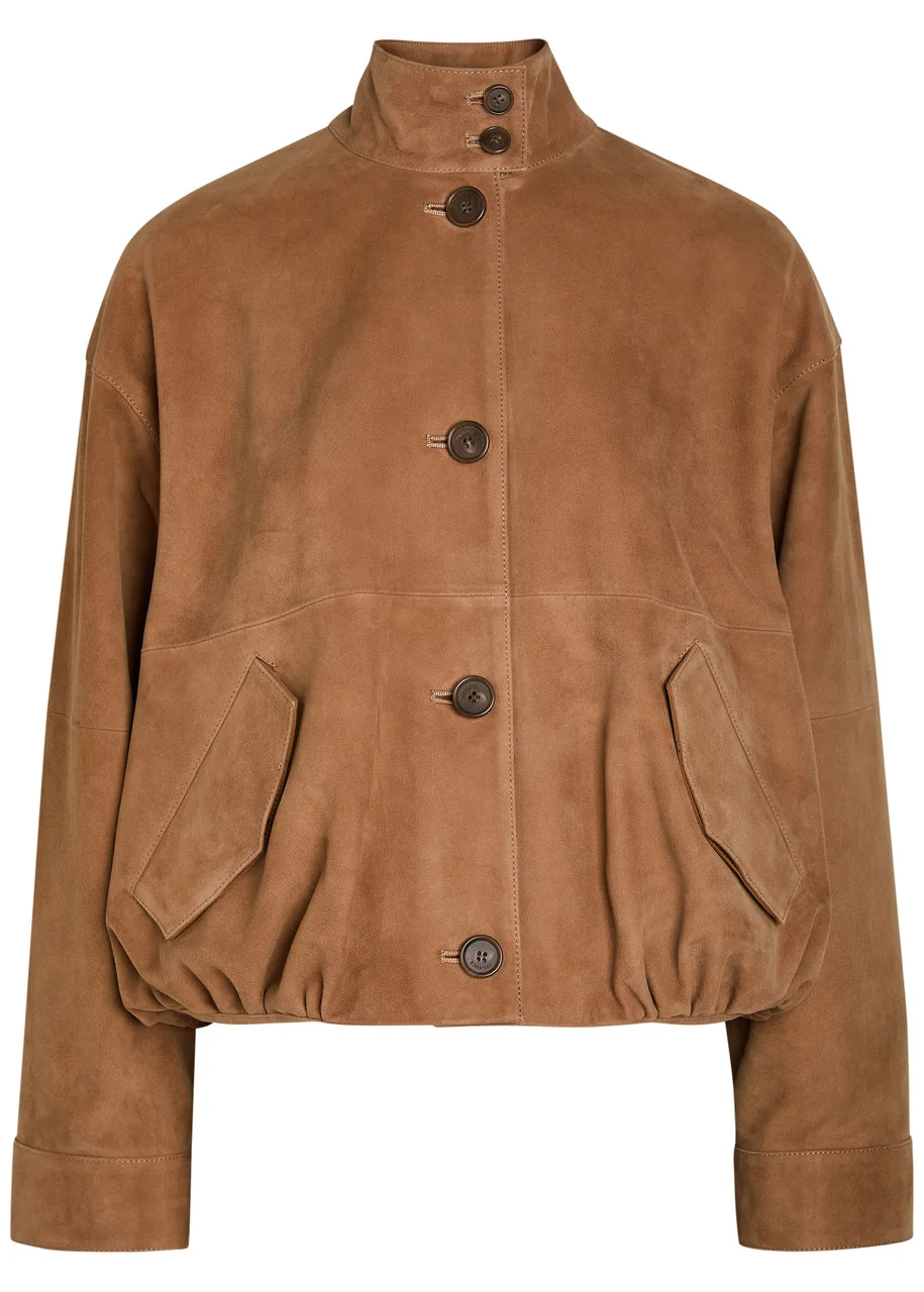 Info & Care Jonathan Simkhai suede jacket Funnel-neck, dropped shoulders, button-fastening cuffs, button-fastening front flap pockets, gathered balloon hem, fully lined Button fastenings through front 100% goat suede; lining: 51% viscose, 49% cotton Specialist clean Size & Fit Length shoulder to hem: 19 inches/ 48.5cm Midweight Relaxed fit, boxy style Model is 5'10"/ 178cm and wears a size small