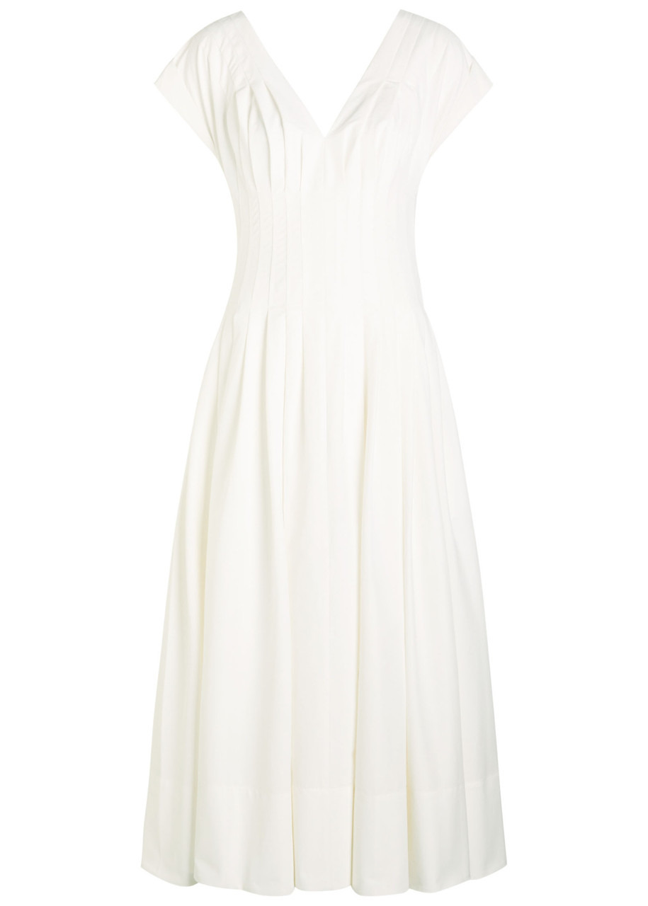 Info & Care Jonathan Simkhai cotton-blend poplin dress; V-neck, turn-up cuffs, pleated bodice, pintucks through waist, side slip pockets, curved hem, fully lined; Concealed;zip fastening;at back 62% cotton, 38% polyamide; lining: 100%;polyester Machine wash Size & Fit Length shoulder to hem:;52.5 inches/ 133cm Midweight Slim bodice, loose skirt Model is 5'8"/ 173cm and wears a size US4