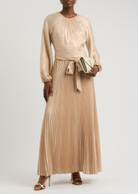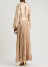 Varenya Belted Pleated Metallic Lamé Maxi Dress