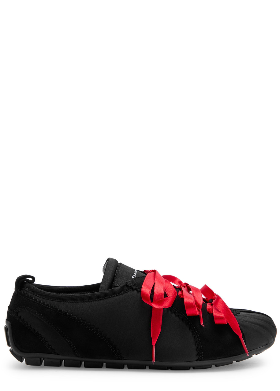 Info & Care Simone Rocha satin;sneakers Pleated details at toe, heel tab, zigzag trims, gripped rubber sole, almond toe Lace-up ribbon front Size & Fit Only available in full sizes, go up to the nearest whole size if you take a half size