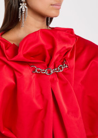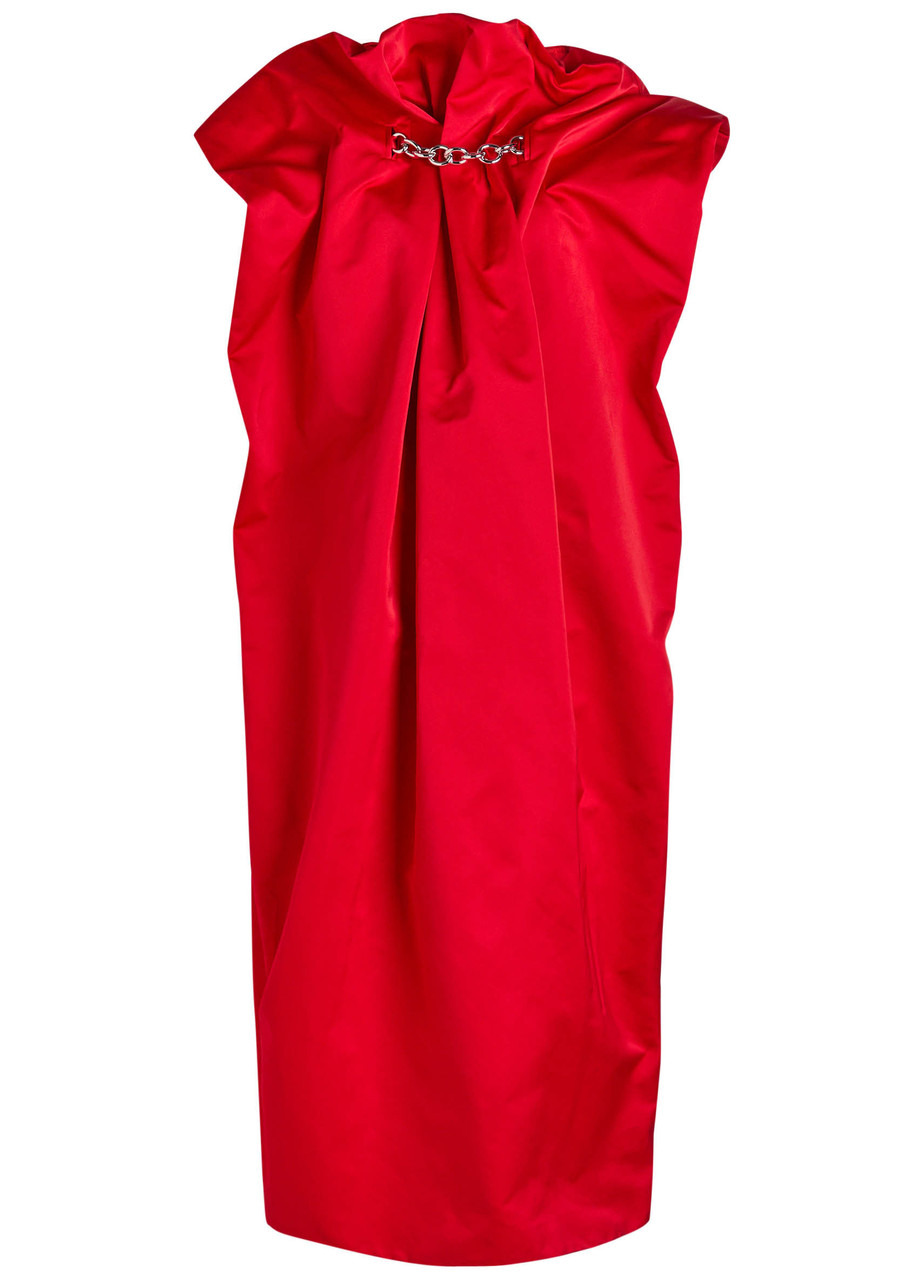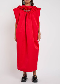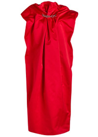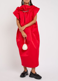 Info & Care Simone Rocha satin dress Draped design, gathered high-neck, cap sleeves, chain embellishment, side slip pockets, pleated details, back vent, fully lined Concealed zip fastening at back 100% polyester; lining: 60% acetate, 40% cupro Dry clean Size & Fit Length shoulder to hem:;50 inches/ 127cm Midweight Loose fit Model is 5'8"/ 173cm and wears a size;UK8