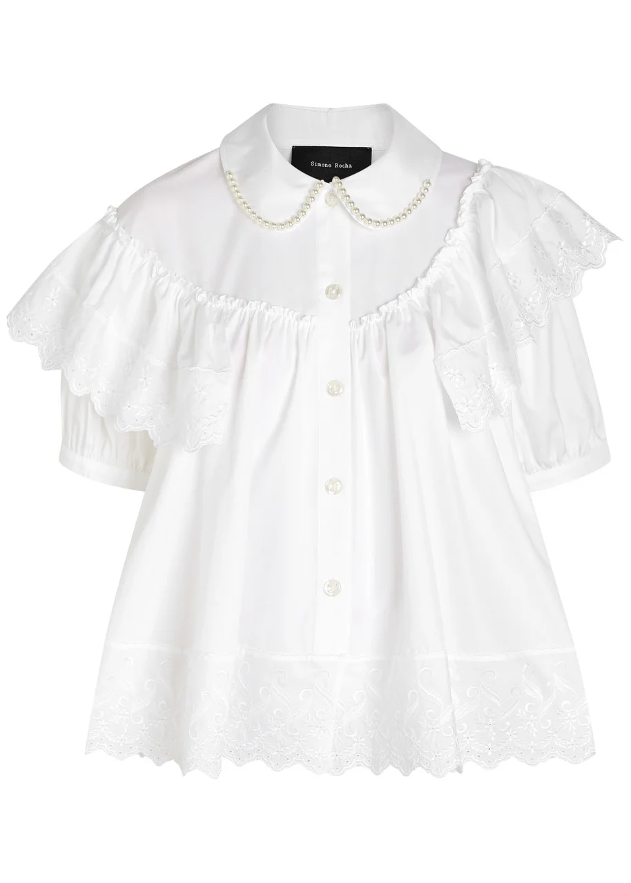 Info & Care Simone Rocha cotton blouse Frilled trims, faux pearl-embellished Peter Pan collar, puff sleeves, button-fastening cuffs, broderie anglaise at scalloped trims, pleated details Button fastenings through front 100% cotton Hand wash Size & Fit Length shoulder to hem: 23 inches/ 58.5cm Midweight Flared style, tailored for relaxed fit Model is 5'10"/ 178cm and wears a size small